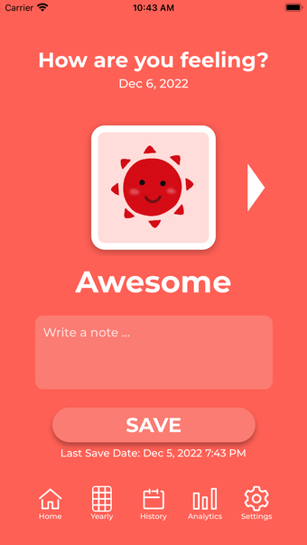 Mood-Tracker, kullanıcıların günlük ruh hallerini kolayca kaydedebilmelerini sağlayan bir yaşam tarzı uygulamasıdır. Uygulamanın ana ekranında ruh halinizi seçmek için okları kaydırabilir veya dokunarak seçebilirsiniz. Kaydet butonuna tıklayarak mevcut ruh halinizi kaydedebilirsiniz. Ayrıca, o anda yaşadığınız durumu ve nedeni notlar kısmında belirterek ruh halinize göre kaydedebilirsiniz. Uygulama, yıllık görünümde günlük ortalama ruh halinizi listeleyerek sunar.